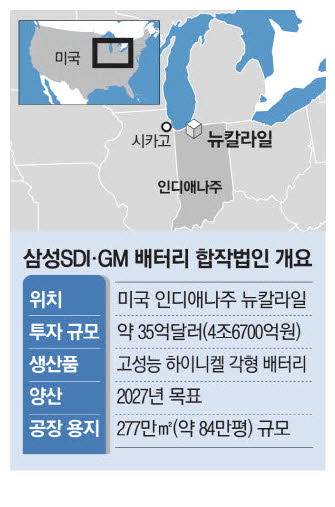 삼성SDI는 GM과 미국 내 전기차 배터리 생산을 위한 합작법인 설립 본계약을 맺었다고 28일 밝혔다. 지난해 3월 메리 배라 GM 회장과 최윤호 삼성SDI 대표이사(사장)가 합작법인 설립 업무협약(MOU)을 맺은 지 약 1년 반 만이다. 합작법인은 인디애나주 뉴칼라일의 277만㎡(약 84만평) 규모 용지에 설립된다. 총 투자 금액은 양사를 합해 약 4조6767억원(35억달러)이다. 삼성SDI의 지분율은 50.01%다. 삼성SDI는 오는 10월부터 2028년 3월까지 약 2조2930억원(17억3200만달러)을 투자한다.