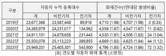이어 "소방청의 화재 통계는 충돌 사고, 외부 요인, 전장 부품 소손 등에 따른 화재를 모두 포함하고 있고 초소형 전기차, 초소형 전기화물차, 전기삼륜차까지 함께 집계되기 때문에 이런 요인을 제외하면 승용 전기차에서 고전압배터리만의 원인으로 화재가 난 사례는 훨씬 줄어든다"고 덧붙였습니다.