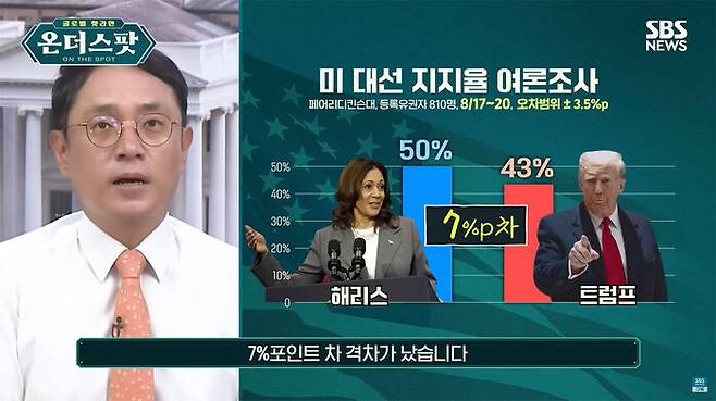 A. 페어리디킨슨 대학이 여론조사를 한 게 있습니다. 8월 17~20일 사이에 조사했는데 민주당 전당대회가 19~22일 사이에 진행됐으니까 조사 기간 나흘 중에 이틀이 겹치는 여론조사입니다. 해리스 부통령이 50%, 트럼프 전 대통령이 43%로 7%포인트 격차가 났습니다. 아마 최근 여론조사 중에는 가장 격차가 큰 것 같습니다.
