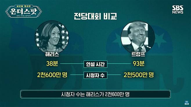 트럼프 전 대통령의 연설은 93분이었고 해리스 부통령의 연설은 38분이었는데 시청자 수는 해리스가 2,600만 명, 트럼프는 2,500만 명대로 해리스 부통령의 후보 수락 연설 시청자가 아주 조금 더 많았습니다.