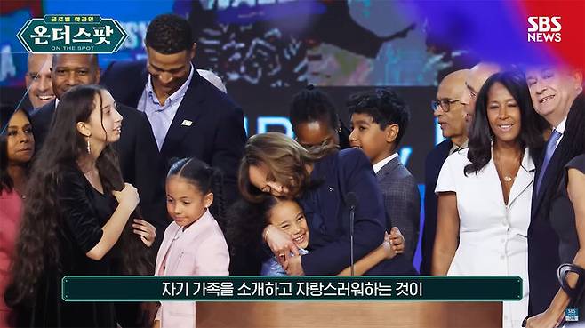 우리는 이런 전당대회나 대선 후보들의 연설에서 가족들이 이렇게 계속 나와서 후보를 직접 소개하는 일이 많지는 않습니다. 하지만 미국은 가족들이 나와서 이렇게 자기 가족을 소개하고 자랑스러워하는 것이 굉장히 일반적이라고 볼 수 있겠습니다.