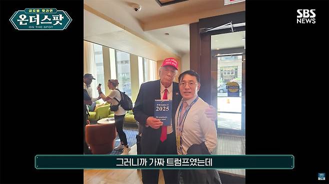 제가 이제 취재를 마치고 들어오는데 시카고에서 가장 만나기 어려울 것 같은 사람, 시카고에 있으면 안 될 것 같은 사람인 트럼프 전 대통령을 마주쳤습니다. 정말 외모가 똑같고 사람들도 몰려 있어서 트럼프가 깜짝 방문한 게 아닌가 싶은 생각이 들 정도였는데, 나중에 봤더니 진짜 트럼프는 아니었고요. 트럼프 분장을 한 배우, 그러니까 가짜 트럼프였는데 정말 MAGA 빨간 모자 쓰고 트럼프 양복 입고 또 손에는 '2025 프로젝트' 책을 들고 있어서 정말 한 10미터 앞에서 보면 트럼프와 정말 똑같은 사람이 있어서 깜짝 놀랐던 아주 재미있는 경험도 했습니다.