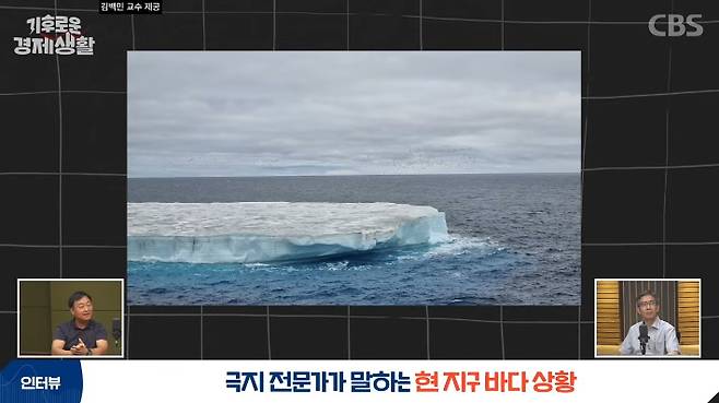 ◇ 김백민> 10m가 넘는 그 빙하가 바다에 둥둥 떠다닌다는 것은 그린랜드라든지 주변의 육지로부터 빙하가 심각하게 유실이 돼가지고 드디어 북극해로 이렇게 떠다닌다라는 거거든요. 그러니까 저렇게 큰 빙하를 북극해에서 쉽게 관찰할 수 있다라는 건, 굉장히 심각한 북극해 현황을 알려주고 있습니다.