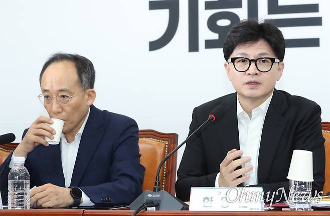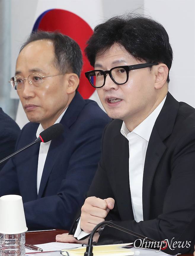 | ▲ 최고위 주재한 한동훈 대표 한동훈 국민의힘 대표가 29일 오전 서울 여의도 국회에서 열린 최고위원회의에서 발언하고 있다. 왼쪽은 추경호 원내대표. |