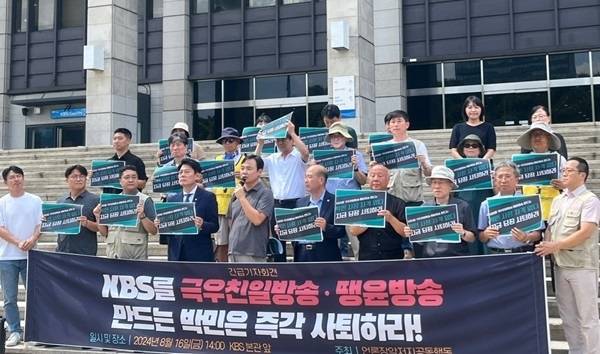 | ▲ "KBS를 극우친일방송, 땡윤방송으로 만드는 박민 즉각 사퇴 촉구" 언론장악저지공동행동 주최로 16일 오후 서울 영등포구 KBS 본관 앞에서 열린 'KBS를 극우친일방송, 땡윤방송으로 만드는 박민은 즉각 사퇴하라!' 긴급 기자회견에서 참석자들이 "박민 사장의 사퇴"와 "공영방송 장악 중단"을 촉구하고 있다. |