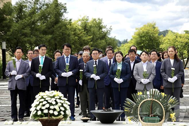 (서울=뉴스1) = 전병헌 대표를 비롯한 새로운미래 지도부와 당원들이 29일 경남 김해시 봉하마을 고(故) 노무현 전 대통령 묘역을 찾아 참배하고 있다. (새로운미래 제공) 2024.8.29/뉴스1
