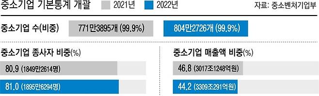 중소벤처기업부가 29일 발표한 ‘2022년 기준 중소기업 기본통계’를 보면, 2022년 말을 기준으로 국내 중소기업 수는 804만2726개로 전년보다 4.3% 증가해 800만개를 넘어섰다. 국내 전체 기업 중 중소기업 비중은 99.9%에 달한다. 중소기업 종사자 수(1895만6294명)와 매출(3309조291억원)도 각각 2.5%, 9.7% 증가했다.