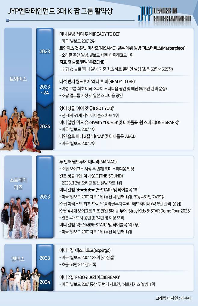 트와이스(2015년 데뷔)와 스트레이 키즈(2018년 데뷔)는 JYP엔터테인먼트를 이끄는 투톱 아티스트다. 두 그룹은 K-팝 업계에 무수히 많은 최초, 최고, 최다의 역사를 쓰고 있다. 이 성취의 근간엔 탁월한 선구안과 혁신이 자리했다.