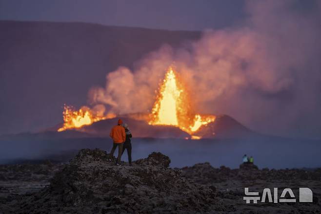 [레이캬네스=AP/뉴시스] 29일(현지시각) 아이슬란드 레이캬네스반도 화산 주변에서 사람들이 용암 분출을 구경하고 있다. 2024.08.30.