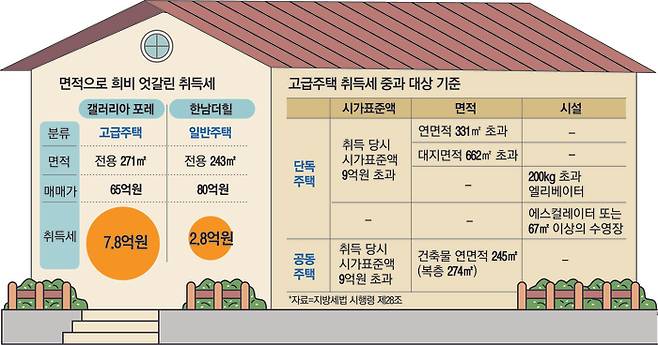 시세 90억원 한남더힐(전용 243㎡)은 일반주택으로 분류돼 취득세 세율 3%가 적용돼 2억7000만원을 내면 되지만, 서울 근교 시세 30억원에 연면적 100평(331㎡ 초과) 2층짜리 주택은 고급주택으로 분류돼 취득세 3억3000만원(11%)을 내야 한다. 더 비싼 집이 세금은 덜 낸다.