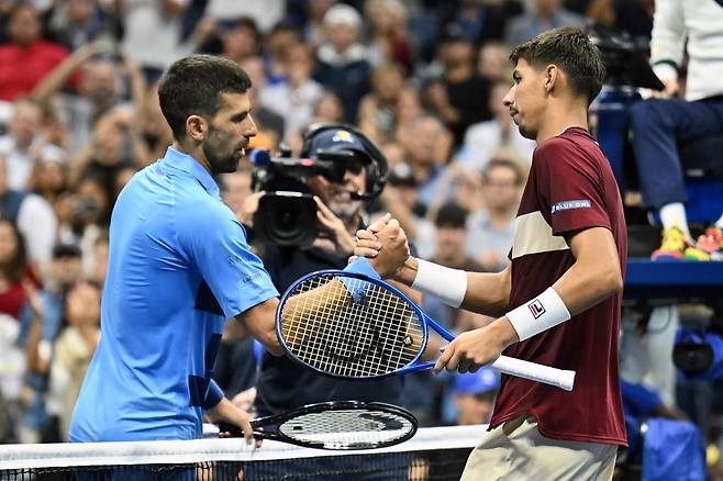 | ▲ 노박 조코비치(왼쪽)가 2024년 8월 31(한국 시간) 뉴욕 빌리 진 킹 내셔널 테니스센터 아서 애쉬 스타디움에서 열린 US 오픈 테니스 대회 5일째 남자 단식 3라운드 경기에서 호주의 알렉세이 포피린에게 패배한 후 인사하고 있다. (사진: 안젤라 와이스 / AFP) |
