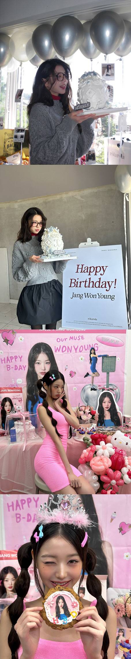 화려한 풍선 장식과 케이크, 선물에 둘러싸인 장원영은 행복한 미소를 짓고 있어 눈길을 끈다.