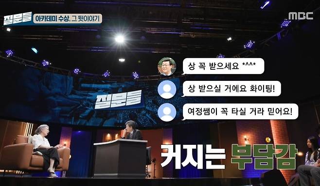 윤여정과 이웃사촌이라는 손석희는 "상 받으셨을 때 같은 동네라 현수막도 걸렸다. '우리 동네가 낳은 세계적 배우'라고"라며 "저도 물론 자랑스럽고 좋았는데, 아직 아날로그적인 것도 있구나 싶어서 더 좋았다"라고 밝혔다. 윤여정은 "힘든 여정이 끝나고 왔는데, 내가 너무 잘 아는 글씨로 현수막이 있어서 '이런 것에 애국심이 생기는구나'하고 뭉클했다"라고 당시 심경을 전했다.