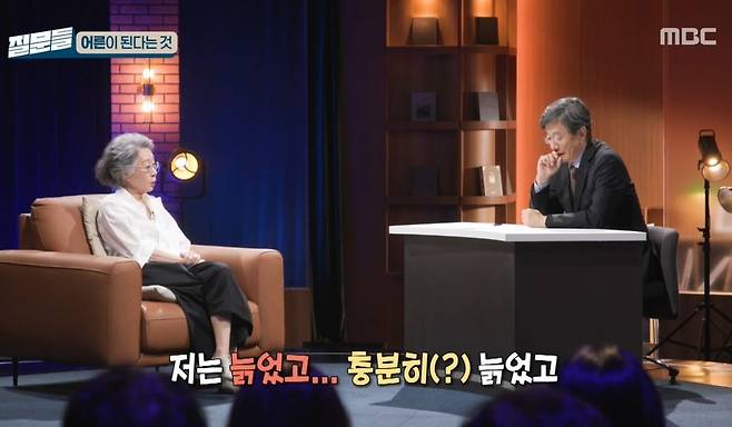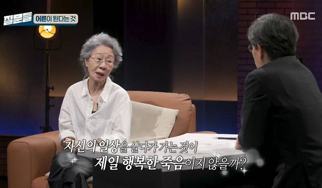 손석희는 "사람에게 나이가 든다는 게 자격지심을 준다고 느끼냐"라고 질문했다. 윤여정은 바로 "네"라고 답하며 "육체적으로 불편이 겹치다 보니 불쾌해지더라. 이 감정을 어떻게 정리해야 하나 생각했다. 누구나 곱게 죽고 싶지 않냐. 고비마다 고민에 봉착한다"라고 밝혔다.