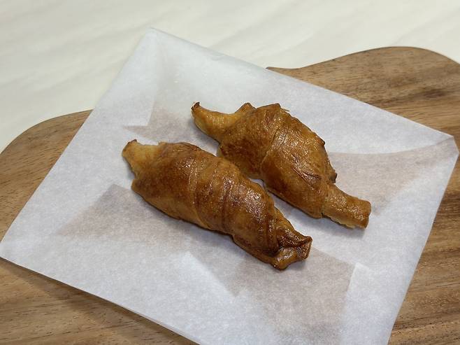 라이스페이퍼로 만들었는데도 반죽을 구울 때부터 크루아상처럼 고소한 냄새가 났습니다. 겉은 바싹 구워져 크루아상의 바삭한 식감과 비슷하면서도 안쪽은 쫄깃쫄깃합니다. 밀가루 대신 쌀가루가 함유되어 있어서 그런지 맛은 깨찰빵에 가깝습니다.