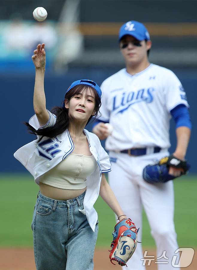 (대구=뉴스1) 공정식 기자 = 1일 오후 대구 삼성라이온즈파크에서 열린 프로야구 '2024 신한 SOL 뱅크 KBO리그' KIA 타이거즈와 삼성 라이온즈의 경기, 러블리즈 유지애가 시구하고 있다. 2024.9.1/뉴스1
