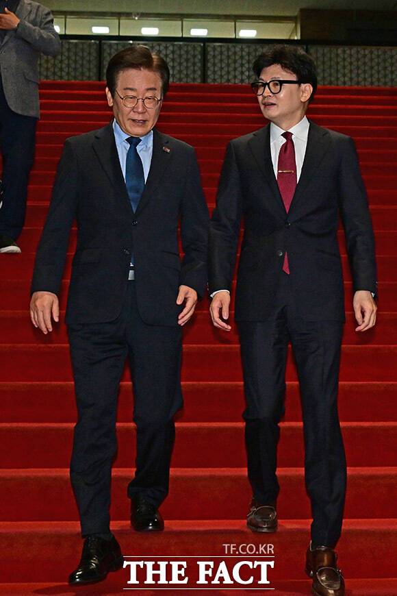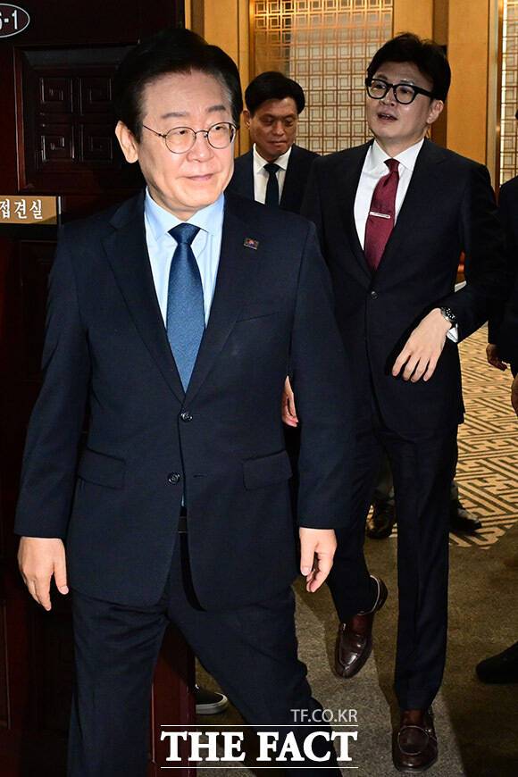 [더팩트ㅣ국회=남윤호 기자] 한동훈 국민의힘 대표와 이재명 더불어민주당 대표가 1일 오후 서울 여의도 국회에서 열린 여야 대표 회담을 마친 후 인사하고 있다.