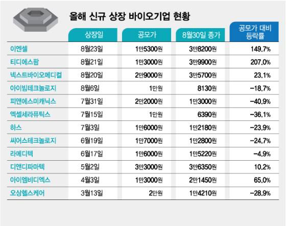 1일 한국거래소에 따르면 지난달 20~23일 잇따라 상장한 넥스트바이오메디컬과 티디에스팜, 이엔셀 등은 공모가 대비 최대 207.0% 상승한 주가로 지난달 30일 장을 마감했다. 올해 먼저 상장한 9개 바이오 기업 중 7개사가 공모가를 하회 중인 것과 상반된 모습이다.