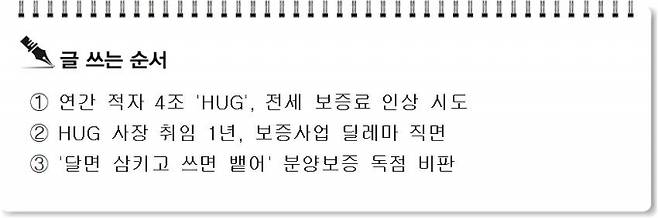 [편집자주] 기업·개인을 상대로 부동산 보증사업을 영위하는 국토교통부 산하 주택도시보증공사(HUG)가 재정 위기에 직면했다. HUG는 외환위기 당시 아파트 선분양사업의 실패로 분양계약자 보호 조치가 필요해짐에 따라 정부 출자를 받아 설립됐다. 분양보증사업을 독점해 고액 수수료 논란이 15년째 지속된다. 2021년 이후엔 고금리 여파로 집값 하락과 전세 사고가 잇따라 보증 부실이 심각한 수준에 이르렀다. 이대로는 다시 혈세를 투입해야 할 판이다. HUG의 현정부 초대 유병태 사장은 전세 보증료율 인상 계획을 밝혔지만 세입자의 주거비를 증가시킬 수 있어 논란이 예상된다.