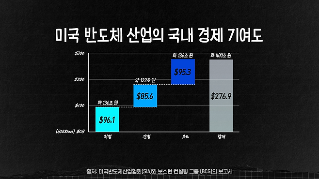 첫 번째가 기본적으로 반도체 생산을 하면서 얻게 되는 국가적 부가가치가 있습니다. 그러니까 생산과 수출에 관련된 규모가 대략 약 136조 원 정도고요. 두 번째가 반도체 생산을 위해서 들어가는, 소부장을 포함한 컨트렉터들이 약 122조 원 정도를 벌어들입니다. 마지막으로 이로 인한 파급 효과입니다. 예컨대 우리나라의 경우 삼성전자 기흥이나 SK하이닉스 이천 주변에 엄청나게 많은 아파트가 생기고 경제활동이 활성화되는 것들이 약 136조 원 이상을 차지합니다. 다 더하면 대략 400조 원 정도가 생기거든요. 경제적 부가가치가 400조 원이 되어 가니까 다들 반도체에 목을 매기 시작한 거죠.