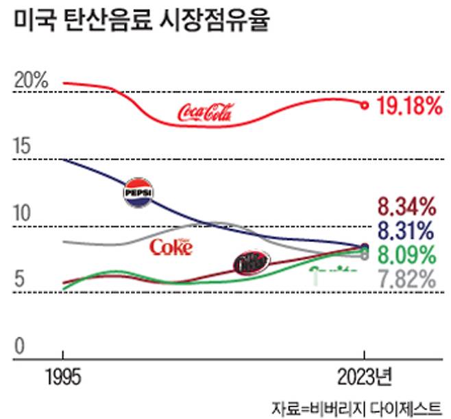 건강에 대한 관심 증가로 탄산음료 소비가 줄면서 다양한 제품군을 보유한 펩시코는 스포츠 음료와 무설탕·무열량 등 이른바 ‘제로(0)’ 음료 등에 대한 사업 비중을 늘리고 있다. 닥터페퍼가 잘해서 점유율이 올라간 측면도 물론 있지만, 펩시코의 전략 수정에 따른 반사이익도 무시할 수 없었다는 얘기다. 실제로 펩시코는 2020년 에너지 음료 제조 업체 록스타를 38억5000만달러(약 5조1944억원)에 인수했다. 1998년부터 지난해까지 미국에서 탄산음료 판매(물량 기준)는 24% 감소했다.