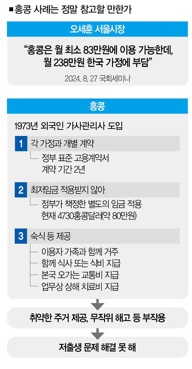 ![오세훈 서울시장은 최저임금을 적용하지 않는 홍콩 방식의 외국인 가사관리사 도입을 주장하고 있다.[사진=뉴시스]](https://img1.daumcdn.net/thumb/R658x0.q70/?fname=https://t1.daumcdn.net/news/202409/02/thescoop1/20240902114927397wryq.jpg)
