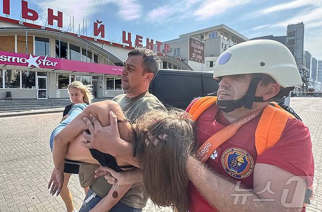 (하르키우 로이터=뉴스1) 우동명 기자 = 1일(현지시간) 우크라이나 하르키우에서 러시아 군의 미사일 포격을 받아 부상을 당한 주민을 자원 봉사자들이 옮기고 있다. 2024.09.02
