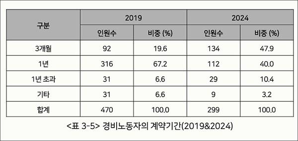 그 결과, 경비노동자의 고용방식 중 용역업체 하청 비율이 95%에 이르는 것으로 나타났다. 이는 같은 기관에서 지난 2019년에 조사한 결과인 54%보다 무려 41%나 증가한 수치다. 또한 계약기간에 있어서도 3개월 초단기 계약이 2019년 19.6%에서 47.9%로 크게 증가했다.