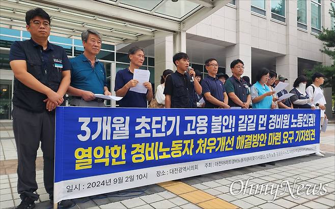 이날 발언에 나선 이상호 공공운수노조 대전지역일반지부 지부장 직무대행은 "경비노동자들은 간접고용, 3개월 초단기계약이라는 매우 불안정한 계약 형태로 일하고 있다. 이로 인해 지속적인 고용 불안에 시달리고 있으며, 자신의 권리를 주장하기 어려운 환경이 조성되고, 심각한 인권침해를 당하고 있다"며 "대전시와 행정기관, 지방의회 등은 이러한 현실을 외면하지 말고 적극적으로 나서 경비노동자들의 최소한의 인권을 보장하기 위해 노력해야 한다"고 말했다.