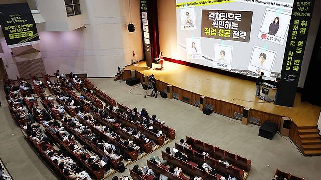 ▲ HR테크기업인 인크루트가 27일 오후 서울 동작구 숭실대학교 한경직기념관에서 연 '2024 하반기 인크루트 채용설명회'에서 구직자들이 참석해 있다. 이번 채용설명회에서는 넥슨코리아, 포스코, LG화학, GS리테일, CJ 등 5개 기업의 인사담당자가 참여해 하반기 채용 일정을 공개했다.