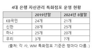 은행들이 줄인 전체 점포 수와 비교하면 자산관리(WM) 전문 채널은 소폭 줄어드는 데 그쳤다. 국민은행 자산관리 특화 점포는 2019년 말 24개에서 지난달 말 기준 21개로 3개가 순감소했다. 신한은행은 같은 기간 28곳에서 25곳으로 역시 3곳이 줄어들었다.