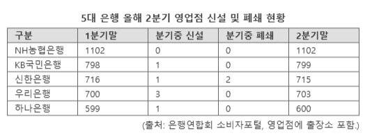 2일 은행연합회 소비자포털 공시에 따르면 5대 은행(KB국민·신한·하나·우리·NH농협)은 올해 2·4분기 신한은행을 제외하고 영업점(지점+출장소)을 유지하거나 확대한 것으로 나타났다. 전국에 영업점이 가장 많은 농협은행은 지난 2·4분기 중 영업점을 신설·폐쇄하지 않고 총 1102개 영업점을 유지했다. 국민은행과 하나은행은 분기중 한 개를 늘려 각각 799개, 600개 점포를 운영하고 있다. 우리은행은 2·4분기에 영업점 3개가 순증돼 전국적으로 703개 점포를 갖고 있었다.