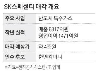 SK그룹이 반도체 특수가스 분야 세계 1위 기업인 SK스페셜티 매각을 추진 중인 가운데 국내 대형 사모투자펀드(PEF)인 한앤컴퍼니가 유력한 인수 후보로 떠오르고 있다.