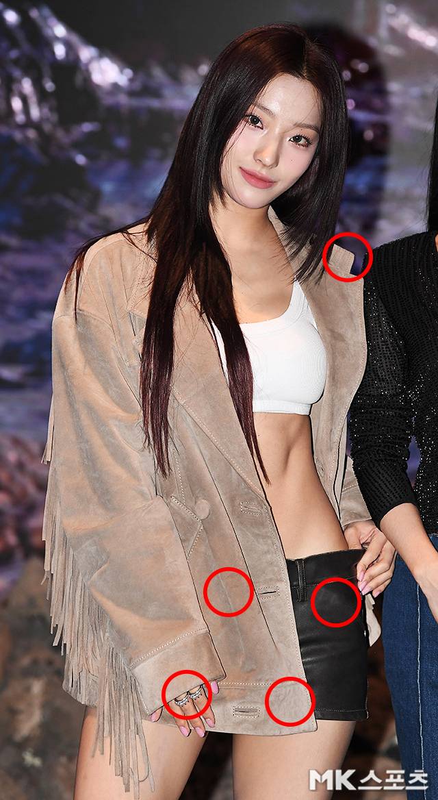 이날 행사에서 이새롬은 태슬이 장식된 재킷에 화이트 브라탑을 매치했고, 블랙의 가죽 쇼츠로 과감하고 아찔한 패션을 완성했습니다.