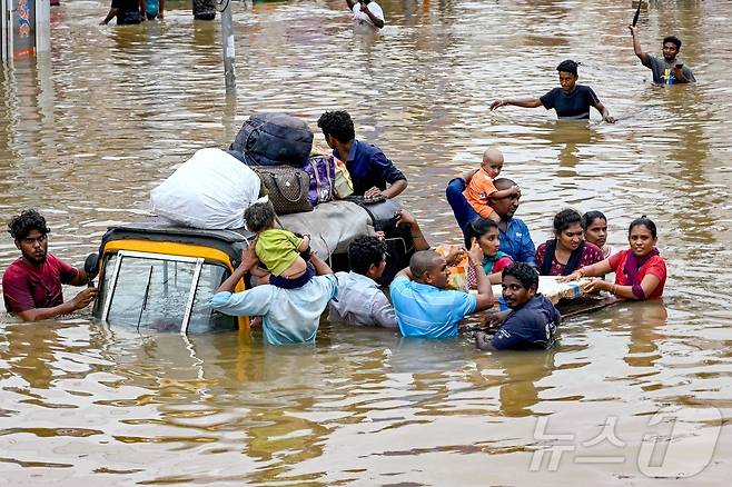 (비자야와다 AFP=뉴스1) 우동명 기자 = 2일 (현지시간) 몬순 폭우가 쏟아진 인도 비자야와다에서 주민들이 물에 잠긴 도로에서 살림살이를 옮기며 대피하고 있다. 2024.09.03