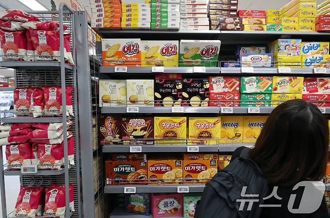 (서울=뉴스1) 박정호 기자 = 라면, 과자, 음료, 쌀가공식품 등 수출이 역대 최대 실적을 기록한 3일 서울 시내의 대형마트에서 고객이 과자을 고르고 있다.