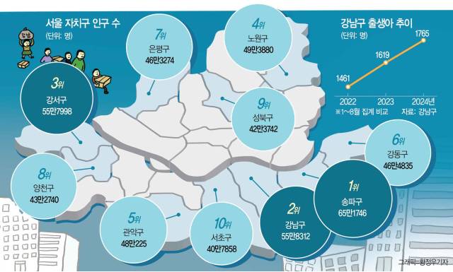 강남구의 막강한 출산지원금도 인구를 빨아들이는 배경이다. 강남구는 기존 첫째 자녀 30만 원, 둘째 자녀 100만 원이던 출산양육지원금을 지난해부터 모두 200만 원으로 증액했다. 강남에서 첫째 아이를 낳으면 소득 기준과 무관하게 서울시·강남구의 현금 및 바우처 지원으로 첫 달에 최대 740만 원을 받을 수 있다.