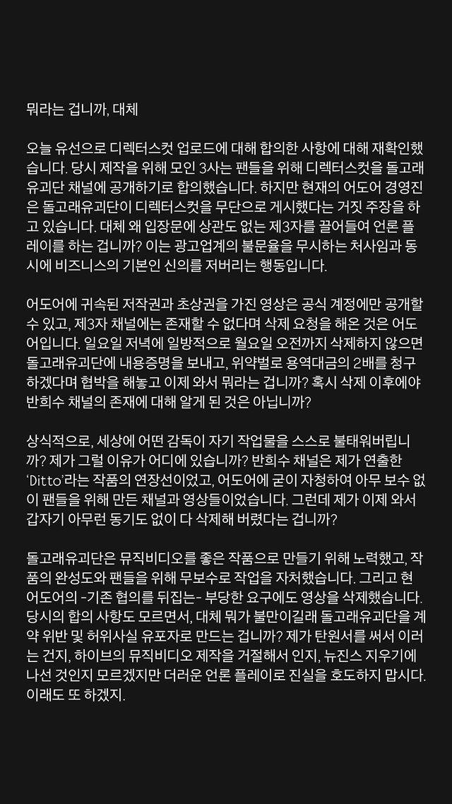 그는 "상식적으로 세상에 어떤 감독이 자기 작업물을 스스로 불태워버립니까? 제가 그럴 이유가 어디에 있습니까?"라며 "제가 탄원서를 써서 이러는 건지, 하이브의 뮤직비디오 제작을 거절해서 인지, 뉴진스 지우기에 나선 것인지 모르겠지만 더러운 언론 플레이로 진실을 호도하지 맙시다. 이래도 또 하겠지"고 성토했다.