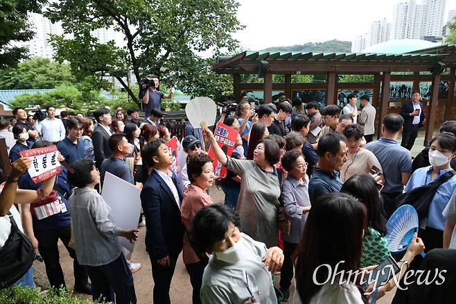 | ▲ 한동훈 국민의힘 대표가 3일 오후 경북 구미시 박정희 전 대통령 생가를 찾았다. 입구에서 몰려든 지지자들과 함께 걸어서 박 전 대통령 생가로 올라가고 있는 모습. |