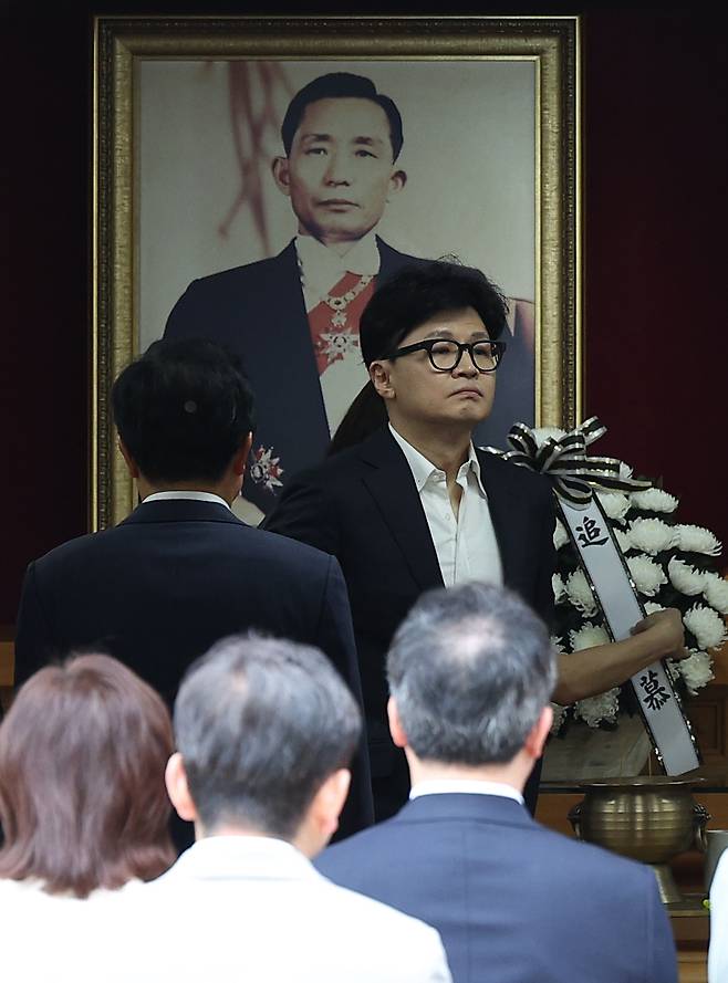 | ▲ 국민의힘 한동훈 대표가 3일 오후 경북 구미시 상모동 박정희 전 대통령 생가 추모관을 방문해 헌화 및 분향을 하고 있다. |