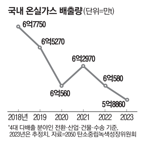 최근 6년간 에너지 부문 온실가스 배출량이 유일하게 늘어난 2021년 사례도 주목할만 하다. 원전 발전을 줄이고 빈자리를 신재생과 화석 발전으로 채우자 탄소배출량이 증가했다. 원전 발전량은 2020년 160.2TWh에서 2021년 158TWh로 1.4%가량 줄었고, 신재생 발전량은 36.5TWh에서 43.1TWh로 18.1% 늘었다. 석탄과 액화천연가스(LNG) 등 화석발전량이 24.2TWh(7.1%) 늘면서 에너지 부문 온실가스 배출량이 2.5% 증가했다.