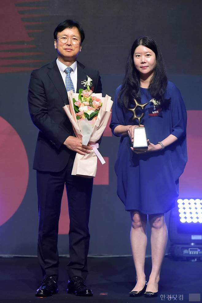 먹는콜라겐 부문을 수상한 뉴트리(브랜드명 에버콜라겐) 임지선 이사(오른쪽)가 전우형 한국경제신문 국장과 포즈를 취하고 있다.