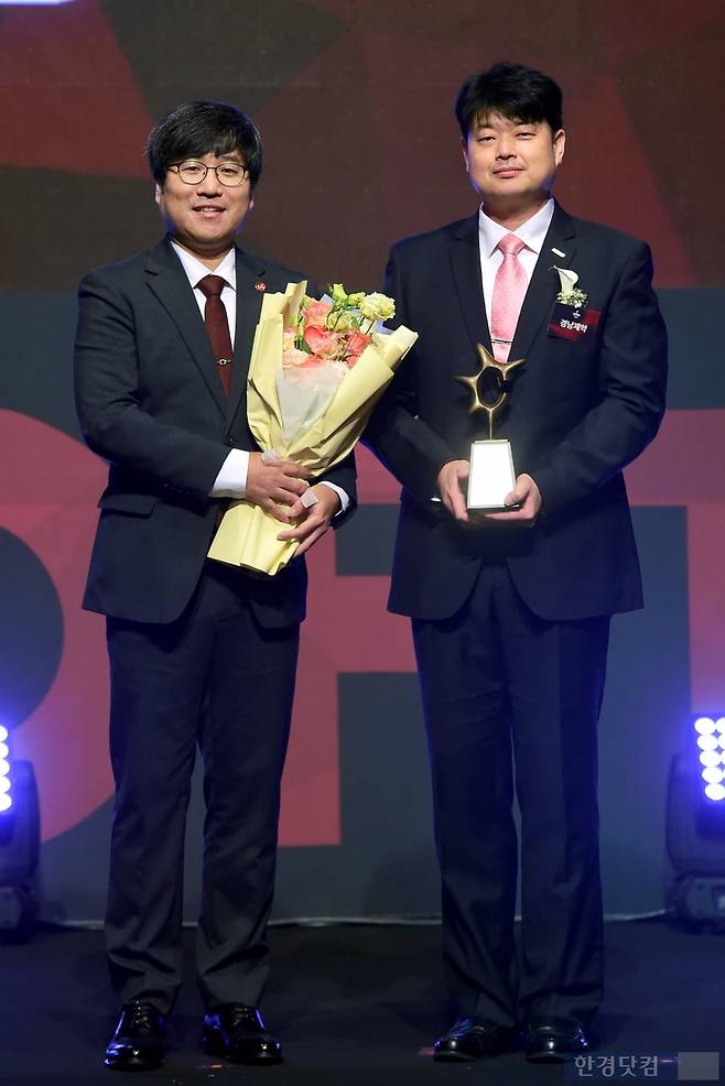 한국소비자브랜드위원회가 주최하고 한국경제신문, 한국소비자포럼이 주관하는 '2024 올해의 브랜드 대상' 시상식이 3일 오후 서울 장충동 신라호텔에서 열렸다. 중국 이너뷰티 부문을 수상한 경남제약(브랜드명 레모나) 송학수 팀장(오른쪽)이 강형빈 인민일보 인민망 한국지사 부대표와 포즈를 취하고 있다.