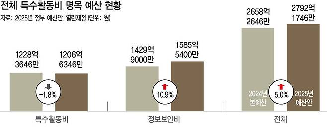 3일 기획재정부가 국회에 제출한 '2025년도 예산안' 세부 자료를 보면, 과거 정부가 특활비 명목으로 지급하던 예산(2023년 이후 특활비+정보보안비)은 2024년 본예산 기준 2658억2천만원에서 내년도 정부 예산안 2792억1천만원으로 5.0% 증가한 것으로 집계됐다.