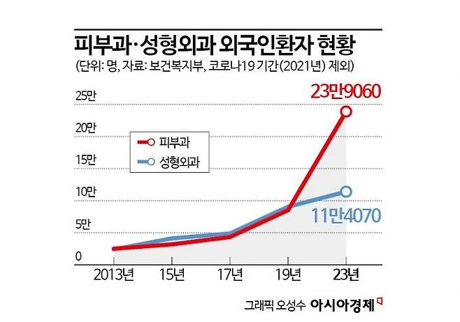 보건복지부에 따르면 지난해 외국인 환자 67만8799명이 우리나라를 찾았는데, 이는 해당 통계 집계를 시작한 이후 역대 최대 규모다. 그중에서도 피부과와 성형외과의 환자는 35만3134명으로 전체의 52%에 달한다. 피부과와 성형외과의 외국인 환자 수는 코로나19 기간을 제외하고 계속해서 증가하는 추세다. 특히 피부과의 경우 10년 전과 비교해 약 10배 수준으로 늘었다. 지난해 피부과를 찾은 외국인 환자 중에서는 일본인이 12만여명으로 가장 많았고, 이어 중국과 미국 등 순으로 나타났다.