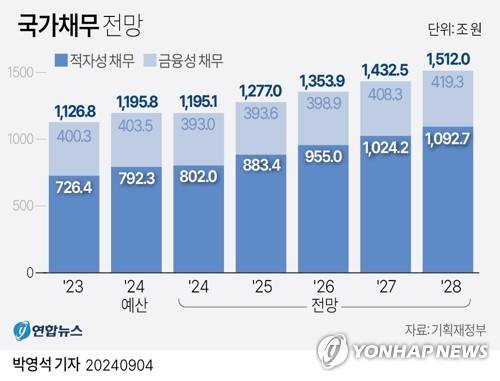 (서울=연합뉴스) 박영석 기자 = 4일 기획재정부가 국회에 제출한 '2024∼2028년 국가재정운용계획'에 따르면 내년 적자성 채무는 883조4천억원으로 올해 전망치(802조원)보다 81조4천억원(10.1%) 늘어날 것으로 예상된다.