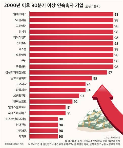 삼성화재는 97분기 연속 흑자 행진을 이어왔고, 금호석유화학(95분기), 고려제강·광동제약(이상 94분기), LG생활건강(93분기), 엔씨소프트(92분기), LS일렉트릭·GS EPS(이상 91분기), 포스코인터내셔널·현대건설·네이버·카카오(이상 90분기) 등도 90분기 이상 연속 흑자를 냈다.