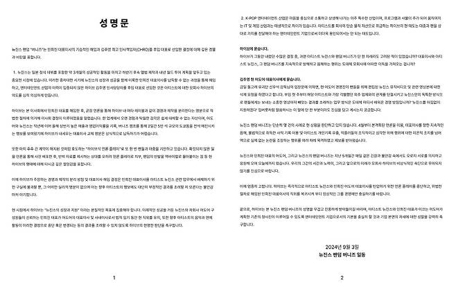민지는 "찾아와서 걱정해주고 위로해주는 많은 버니즈(뉴진스 공식 팬클럽)들에게 괜찮다고 말해주고 위로해주고 싶었는데 이번엔 자신이 없었다. 우리 좋은 이야기만 하기에도 하루가 부족한데 왜 이런 불필요한 수고를 겪어야 하는지 너무 미안하고 아무것도 해결할 수 없는 제가 너무 답답했다"며 "언제까지 이런 불안한 날들이 이어질지 모르겠지만 이런 말을 하는 것도 이기적일 수 있지만 우리 버니즈들과 우리가 힘든 시간을 더 이상 보내지 않았으면 좋겠다"라고 전했다.