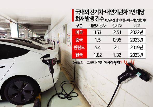 국내도 전기차 화재 발생률이 낮은 것으로 나타났다. 2023년 기준 국내에 등록된 전기차 54만3900대 가운데 72건의 화재가 발생했다. 1만대당 1.32건에서 불이 난 셈이다. 반면 2594만9201건이 등록된 전기차 외의 차종에서는 4724건의 화재가 발생했다. 1만대당 화재 발생 건수는 1.82였다.