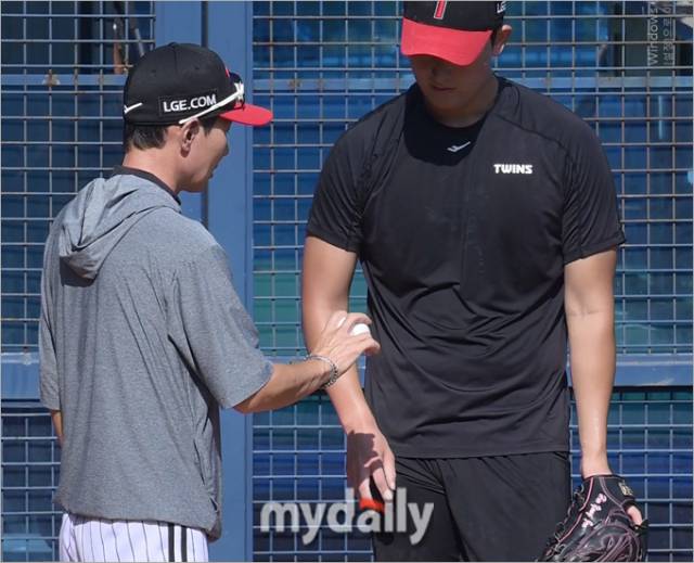 4일 서울 잠실야구장에서 '2024 신한 SOL Bank KBO 리그' SSG 랜더스-LG 트윈스 경기를 앞두고 LG 염경엽 감독이 1군에도 등록 안 된 신예 선수를 직접 가르치고 있다.